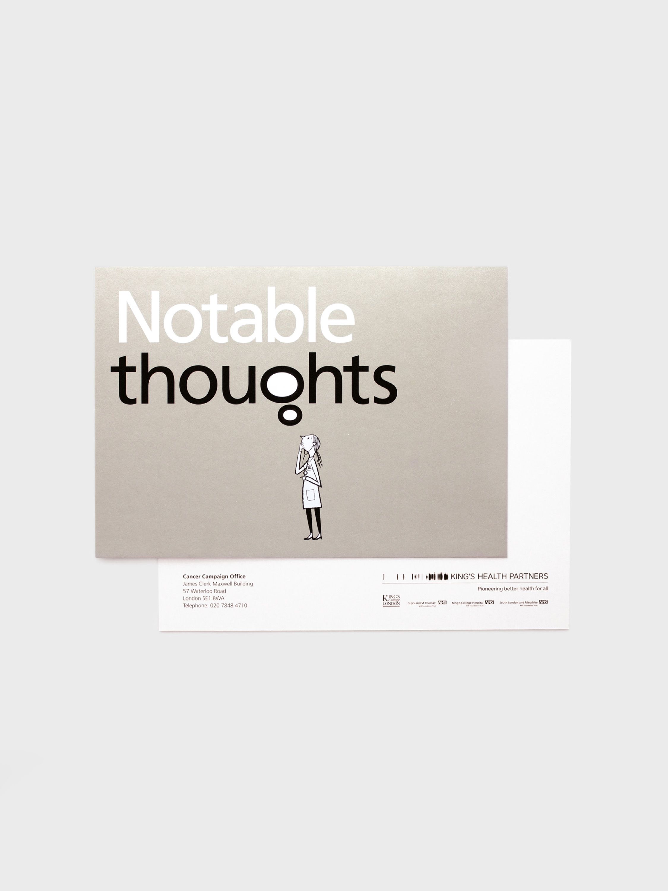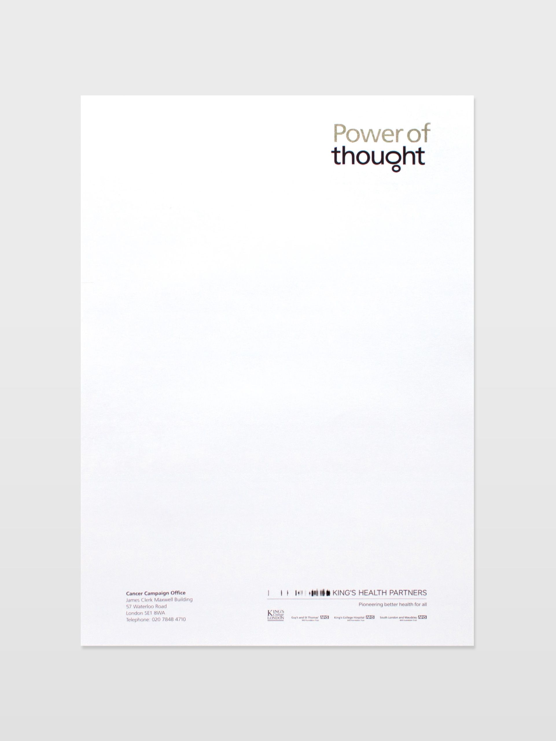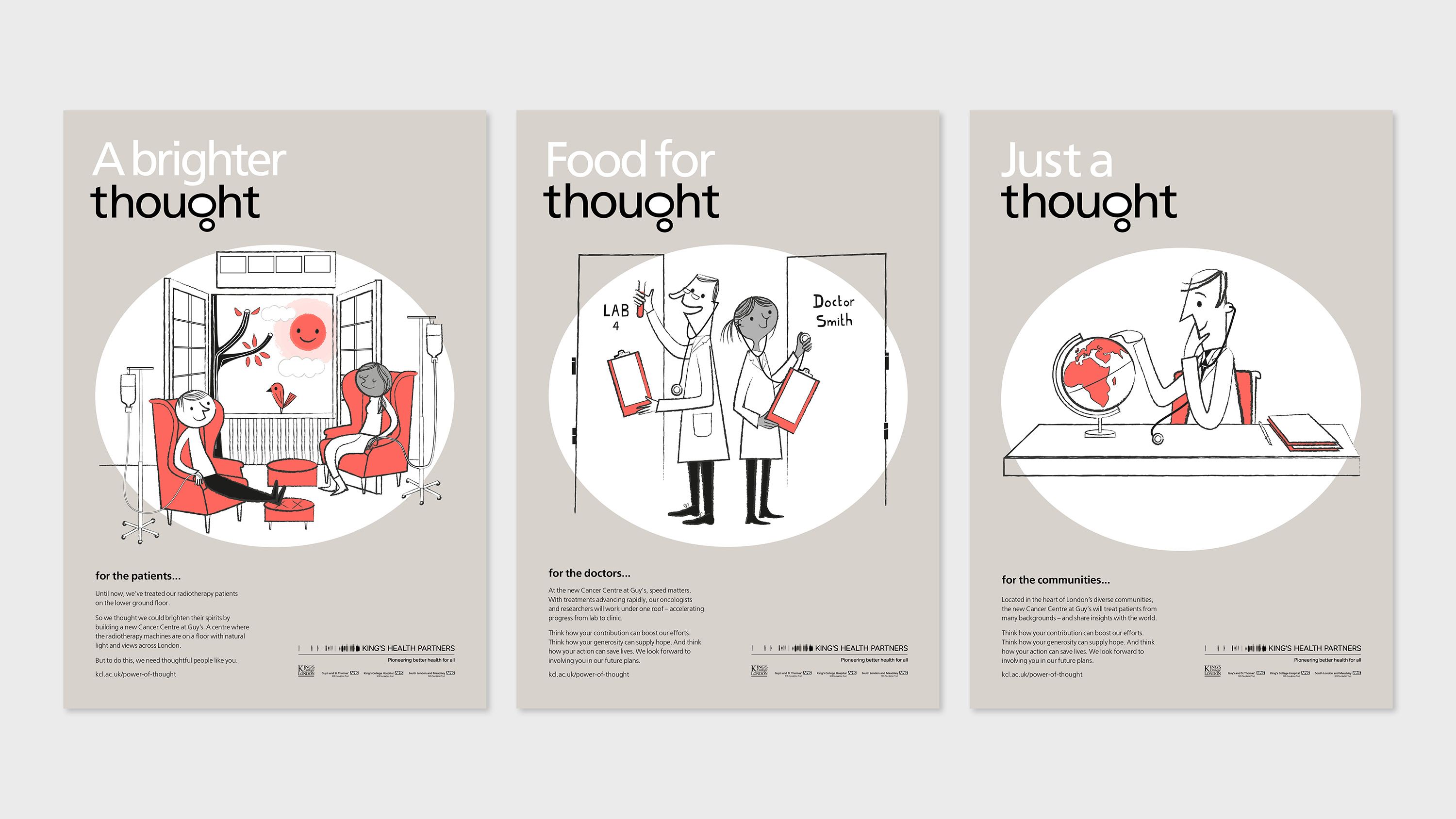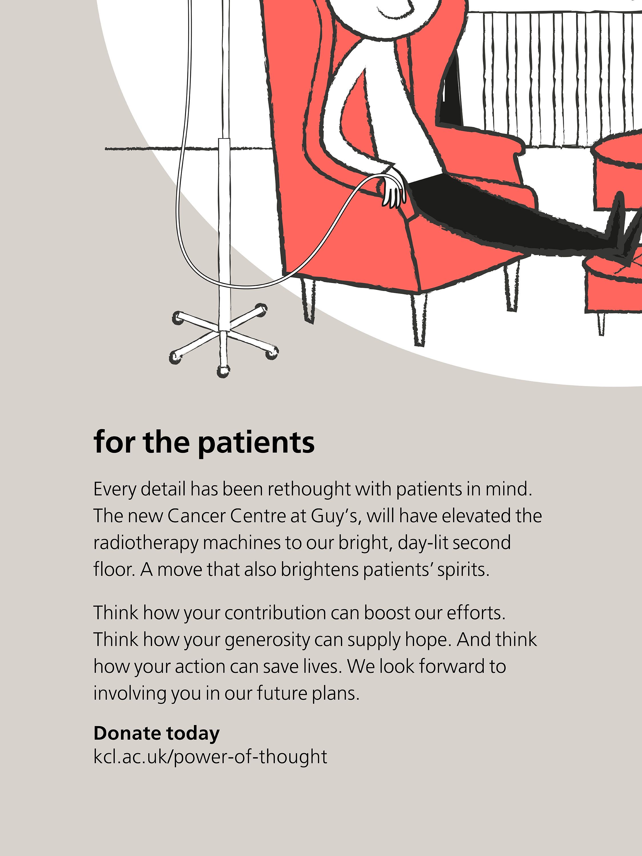 King’s Health Partners wanted to build a ground-breaking Cancer Centre on the Guy’s Hospital site at London Bridge. The ambition for the new 14 storey building, was to become one of the largest Cancer Centres in Europe. It would embody King’s Health Partners’ vision of pioneering better health and well-being, locally and globally, through integrating excellence in research, education and training, as well as patient care. The Fundraising & Supporter Development division of King’s Health Partners asked Rose to help them develop a creative campaign to support their efforts. Their brief was to raise awareness and inform prospective donors about their £30 million fundraising program, to help build the world-leading Cancer Centre at Guy’s Hospital.